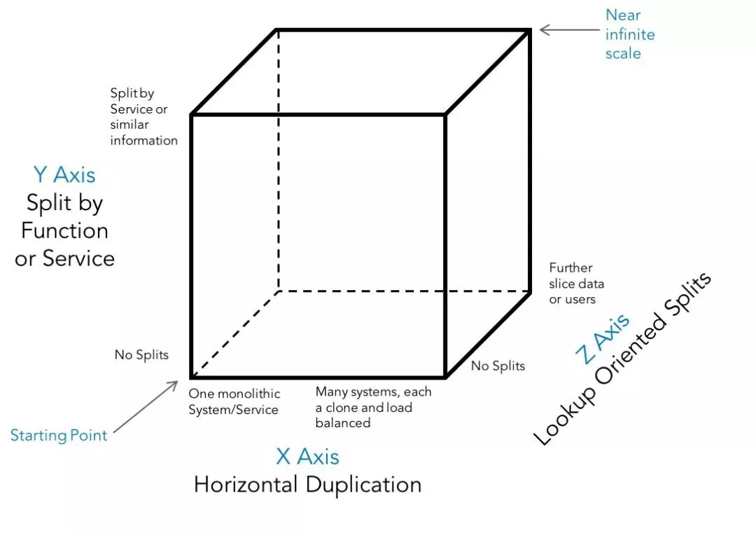 微服务架构的一大裨益是其灵活的扩展性。以上面的 Snapchat 为例,如果需要采集或处理的数据量快速增长,在我们增加应用服务实例的同时,支撑数据存储的模块也要相应扩充。AFK Partners 在他们的 Scale Cube 一文里对性能扩展提出了这样的观点:要设计一个真正意义上的可扩展系统,我们必须考虑 3 个维度,如下所示: