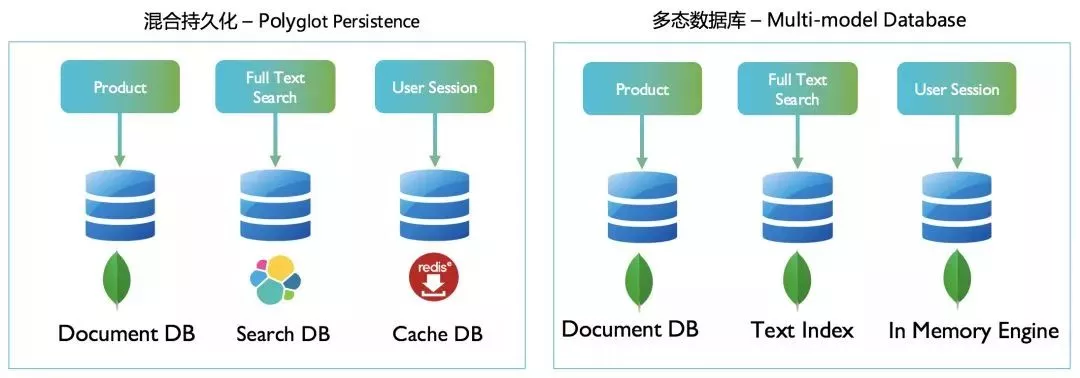 当然,有句话说的是架构师的工作就是每天做不断的取舍 (trade off),因为选择往往是让人很纠结。混合持久化的优势很明显,可以让每个单独的服务使用到最佳的工具和技术。但是它的弊端也是不容忽视。部署、监控、备份、升级等数据库管理工作从来都是一件困难但是重要的任务。引入多个不同的数据库,也意味着对系统管理维护的复杂度和成本提高了很多。这种情况下可能需要比较有资源的公司或者团队才可以使用。这也解释了这个模式在大型互联网公司得到较多的采用与推广。针对于其他小型规模的用户,或者是缺乏足够掌握各种新型技术人才的公司来说,另一种更为可行的模式可能是多模数据库 (Multi-model)。如上图右侧所示。
