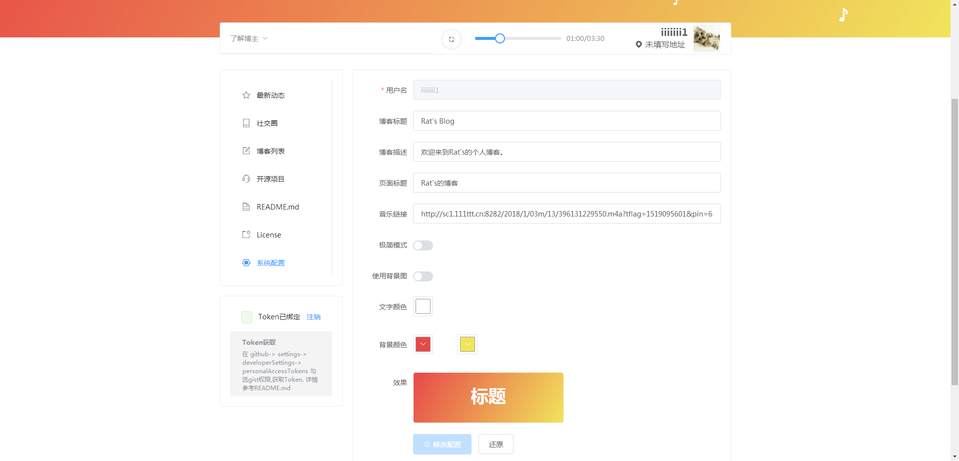 博客基于GitHub Pages与Github API实现无后台,可动态发布博客的系统,博客数据储存于gist通过Github API进行增删改查,带音乐播放区,社交圈,可以动态修改标题,描述,背景等配置。